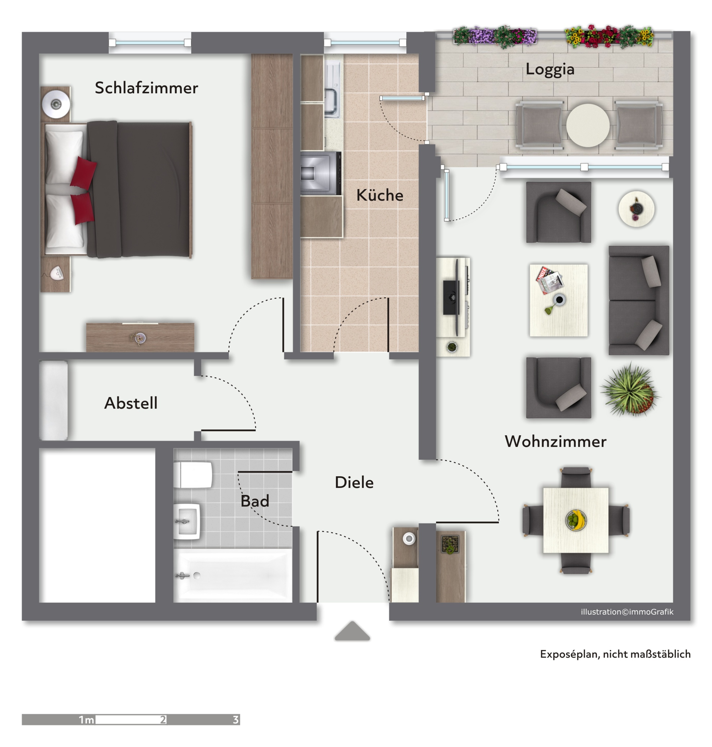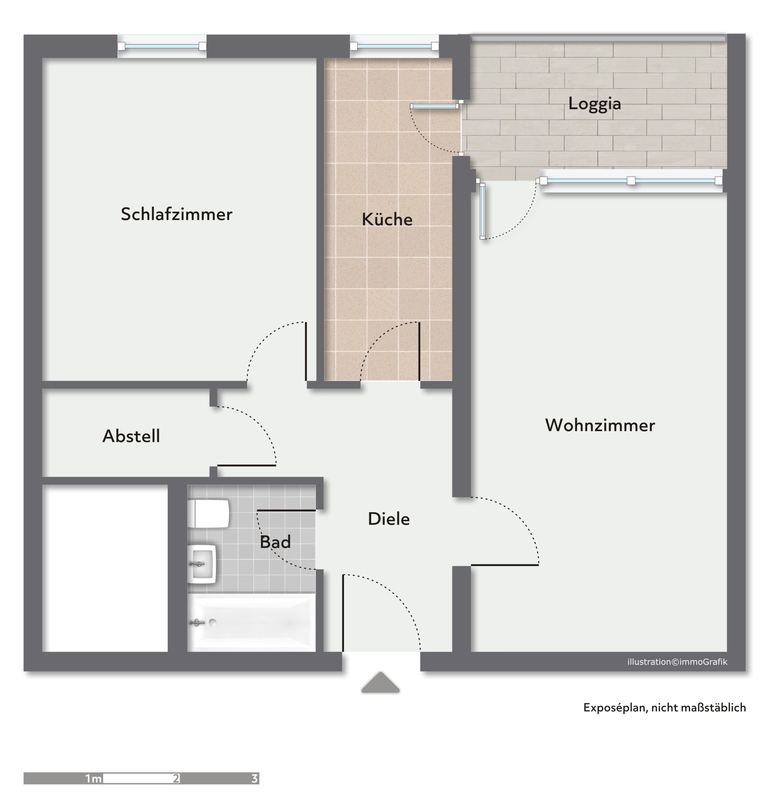 Alle Räumlichkeiten der Wohnung sind über die l-förmige Diele erreichbar: das Bad und die Abstellkammer sind linkerhand, das Wohnzimmer rechter Hand. Küche und Schlafzimmer liegen gegenüber des Eingangs.