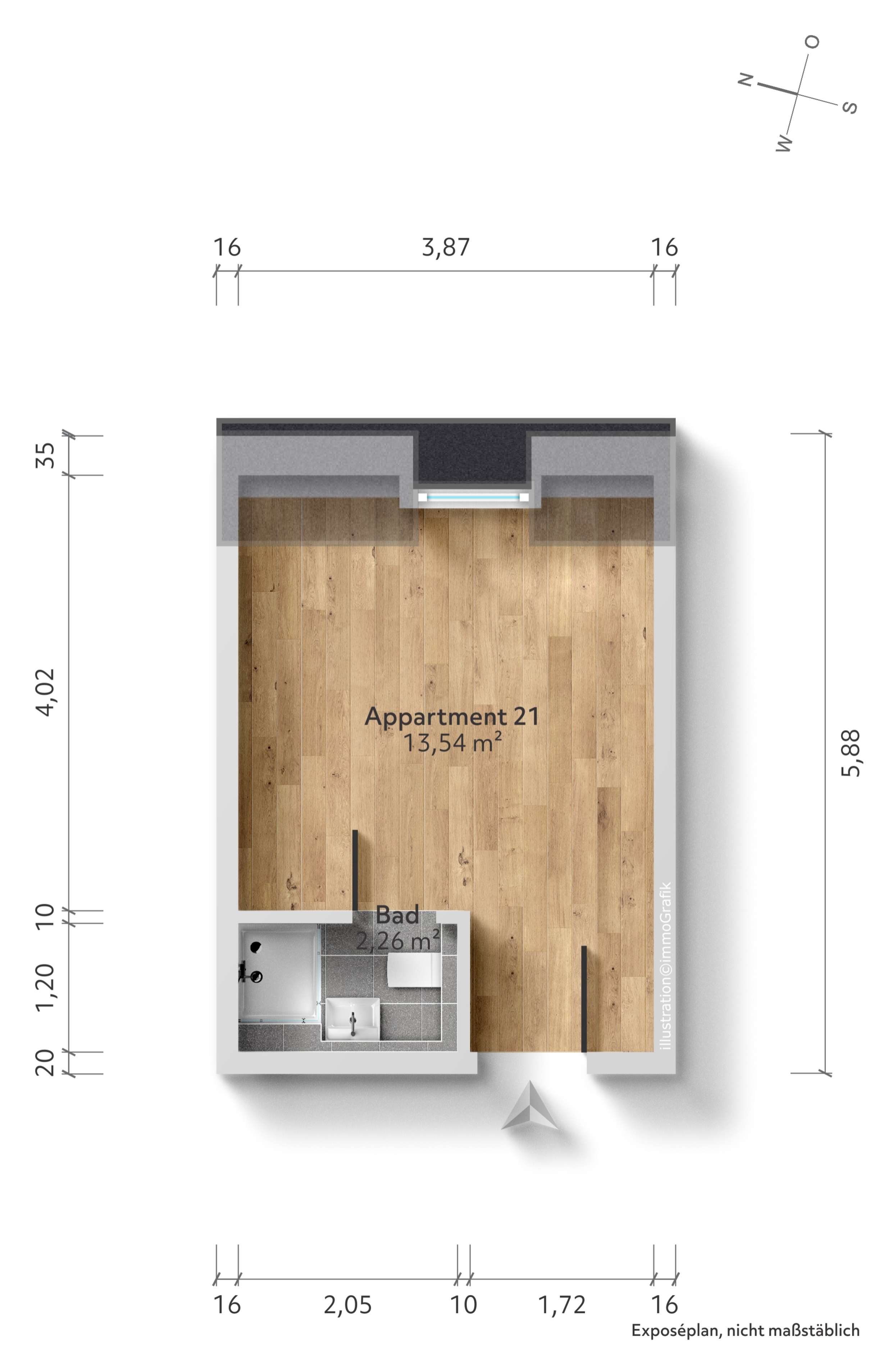 Die Aufteilung der Wohnungen variiert lediglich in der Größe. Sie verfügen jeweils über ein Zimmer und ein Badezimmer mit Dusche. Durch die Fensterfronten wird der Raum mit natürlichem Licht durchflutet und sorgt so für eine helle und freundliche Atmosphäre. Parkett und Fußbodenheizung ergänzen die Ausstattung.