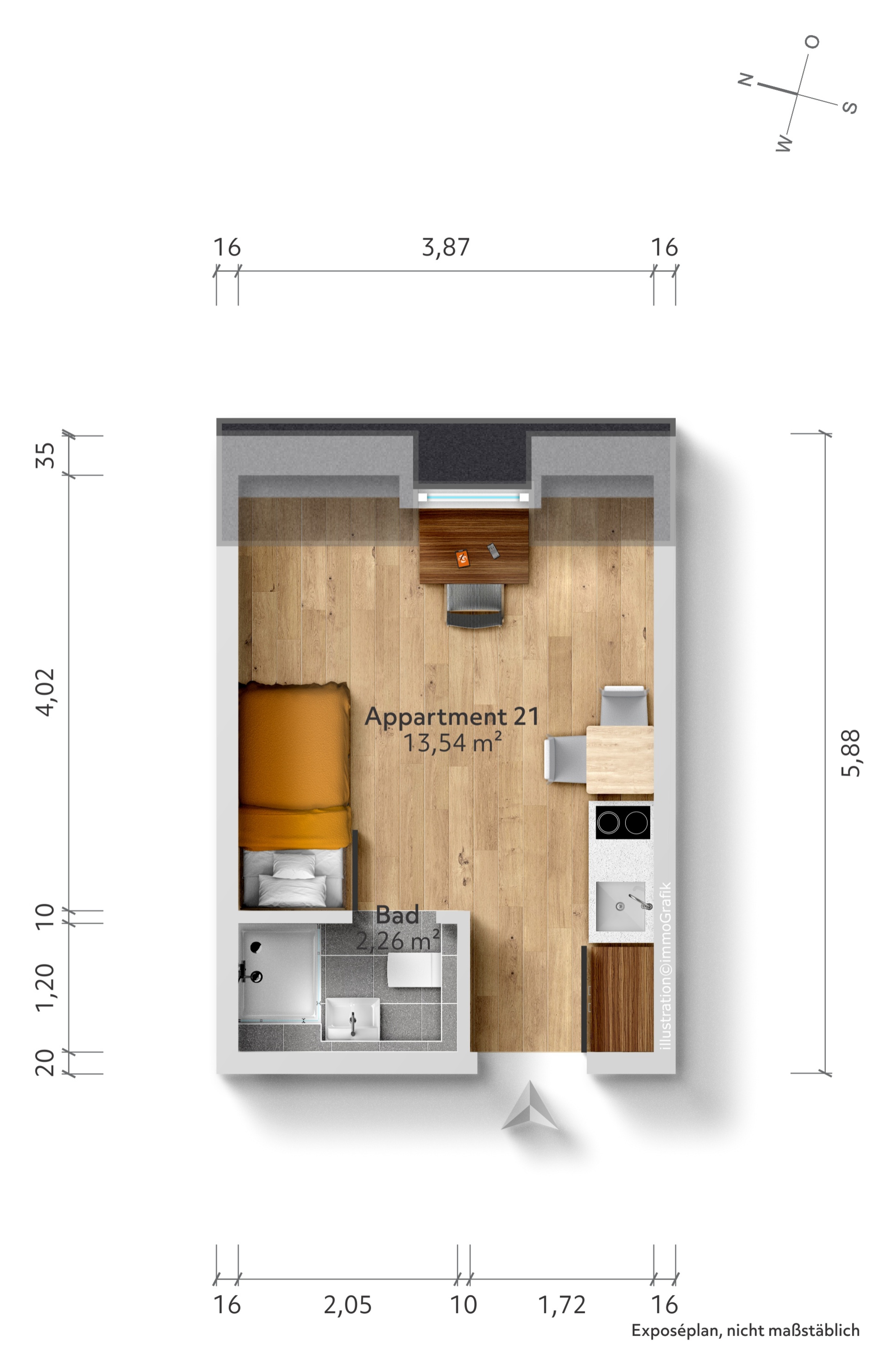 Bitte beachten Sie, dass die Möblierung in den Visualisierungen nur beispielhaft ist. Die Möbel können im Vergleich zu den Visualisierungen abweichen.