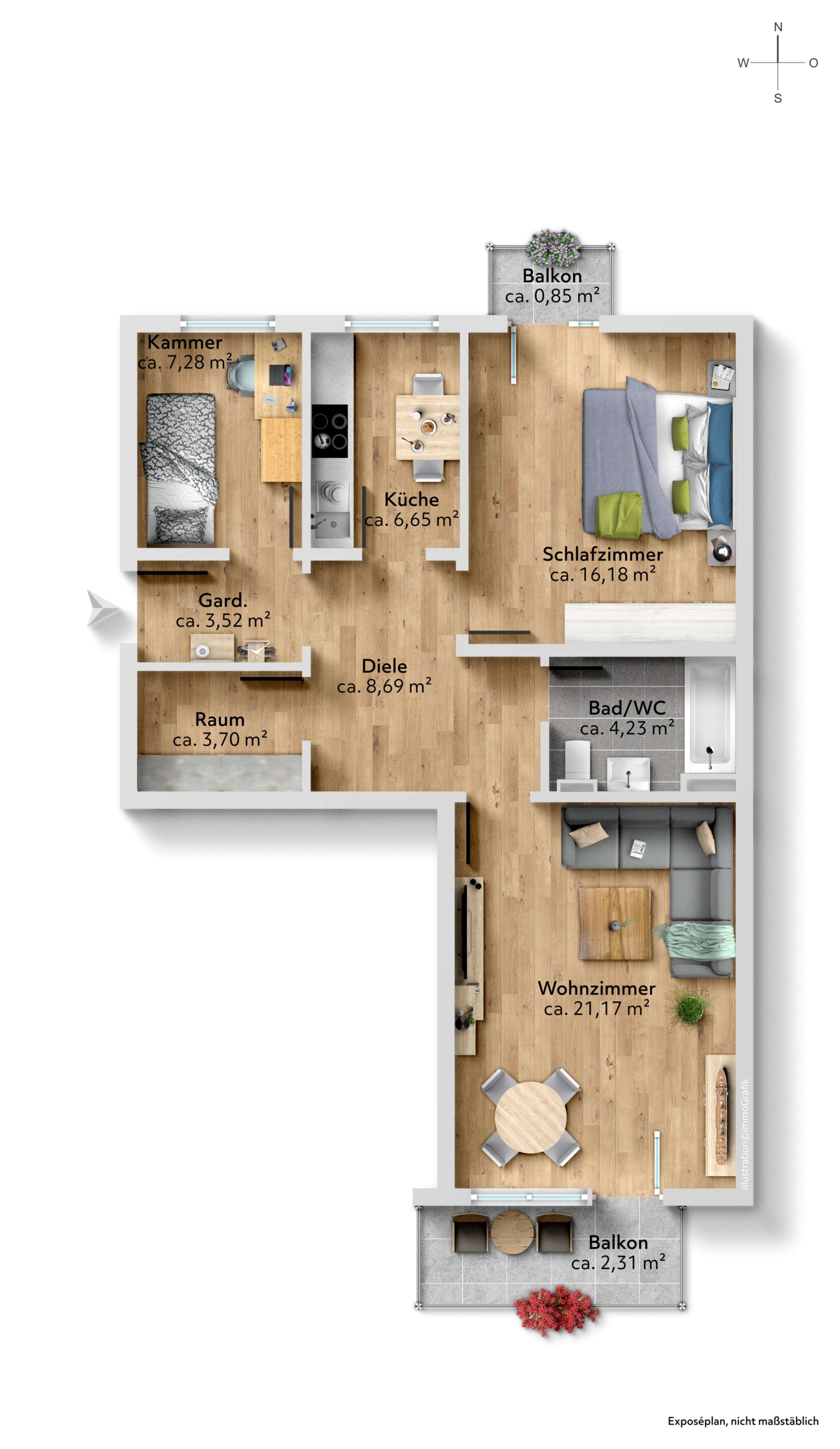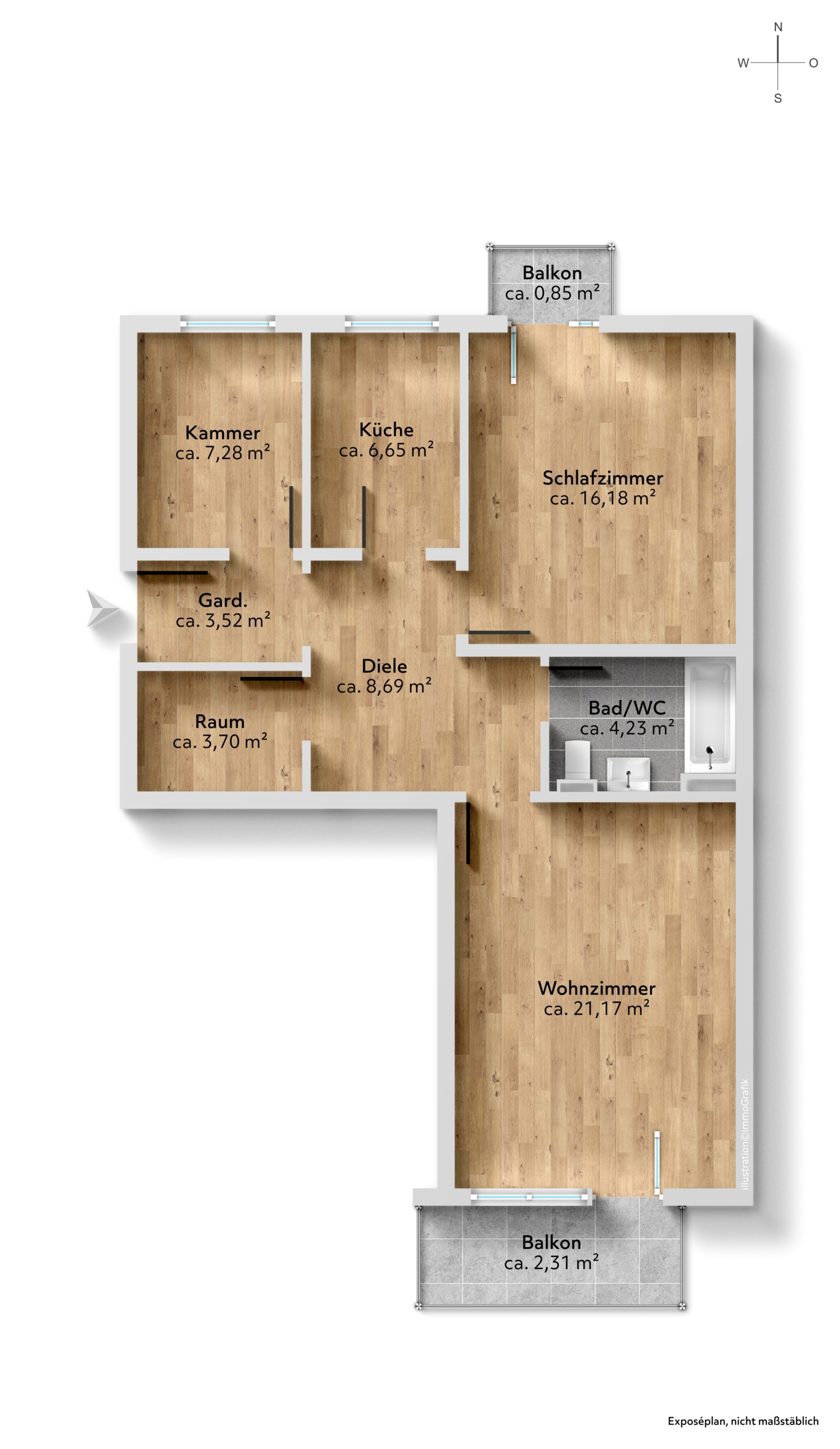 Beim Betreten der Wohnung gelangen Sie über eine großzügige Diele, die ausreichend Platz für eine Garderobe und weitere Aufbewahrung bietet, bequem in alle Räume. Eine praktische Abstellkammer im Eingangsbereich sorgt für zusätzlichen Stauraum und Ordnung.