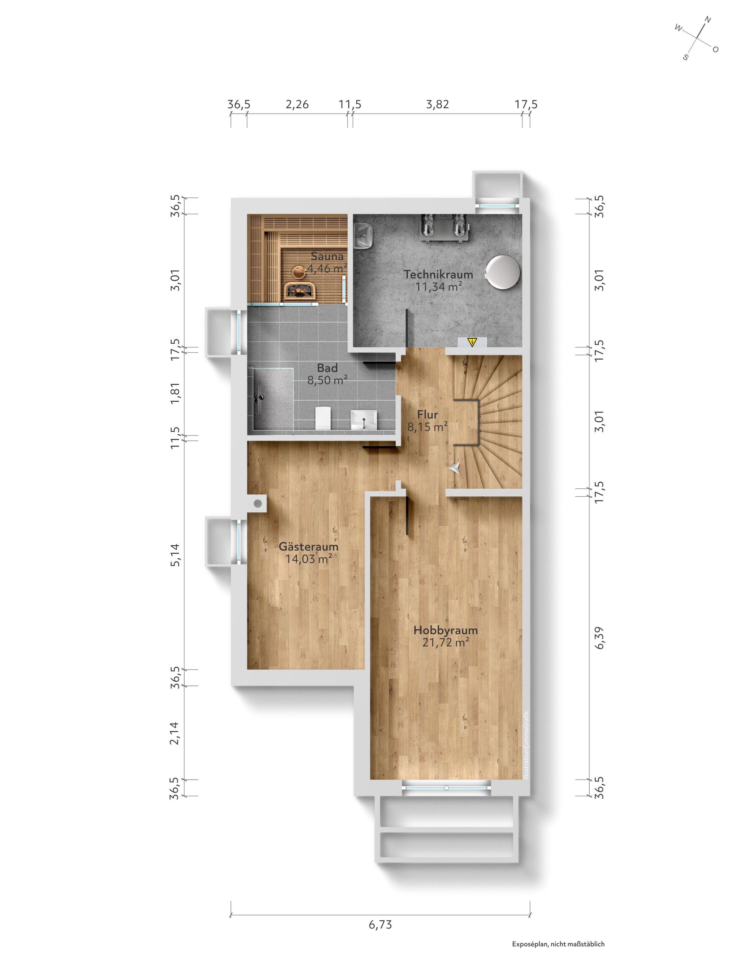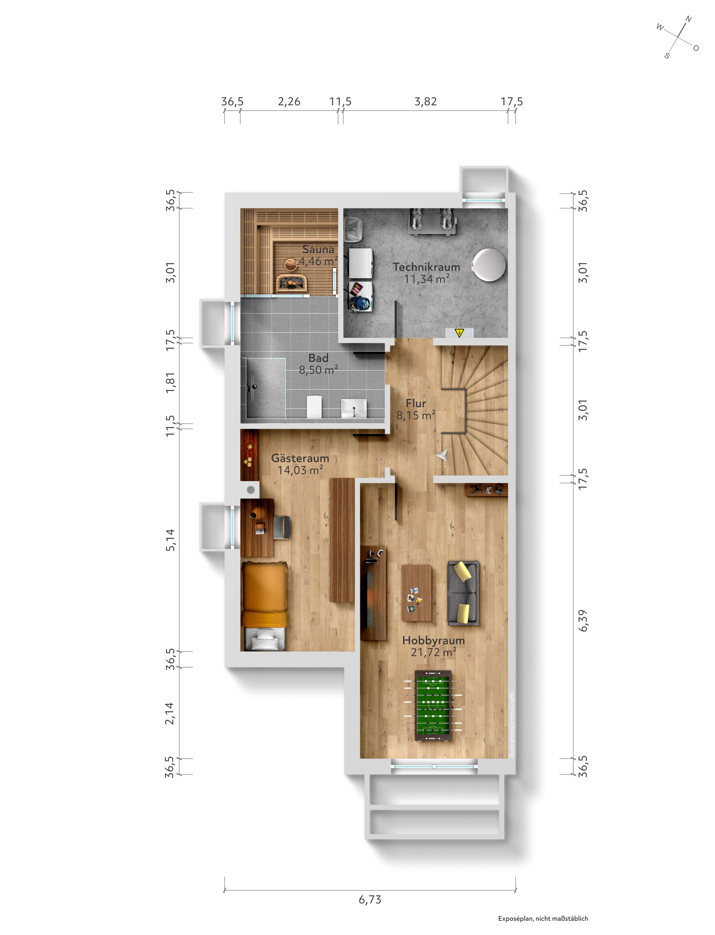 Das vollständig ausgebaute Untergeschoss eröffnet zusätzliche Möglichkeiten zur individuellen Entfaltung – ob als Fitnessbereich, Homeoffice oder Rückzugsort für Gäste. Ein großzügiger, begrünter Lichtgraben sorgt auch hier für angenehmes Tageslicht und ein einladendes Raumgefühl.