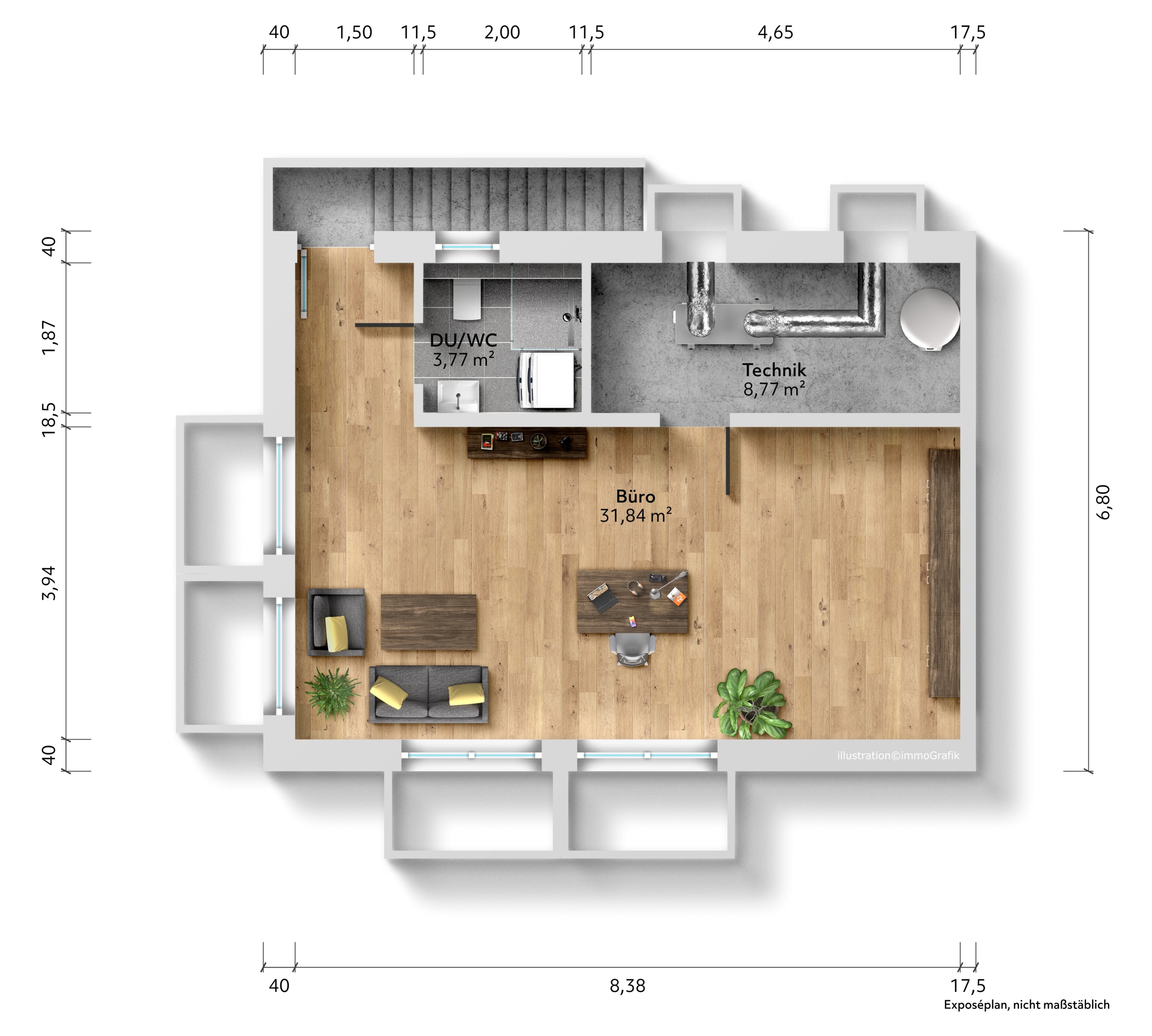 Im Kellergeschoss befindet sich neben dem Technikraum und einem Duschbad auch ein großzügiger Hobbyraum, der dank seines separaten Zugangs über eine Außentreppe und den großen Fenstern Wohnraumqualitäten mit sich bringt und entsprechend vielfältig genutzt werden kann – sei es als Homeoffice, Kundenbüro, Fitnessraum, Atelier, Heimkino oder zusätzlicher Stauraum.