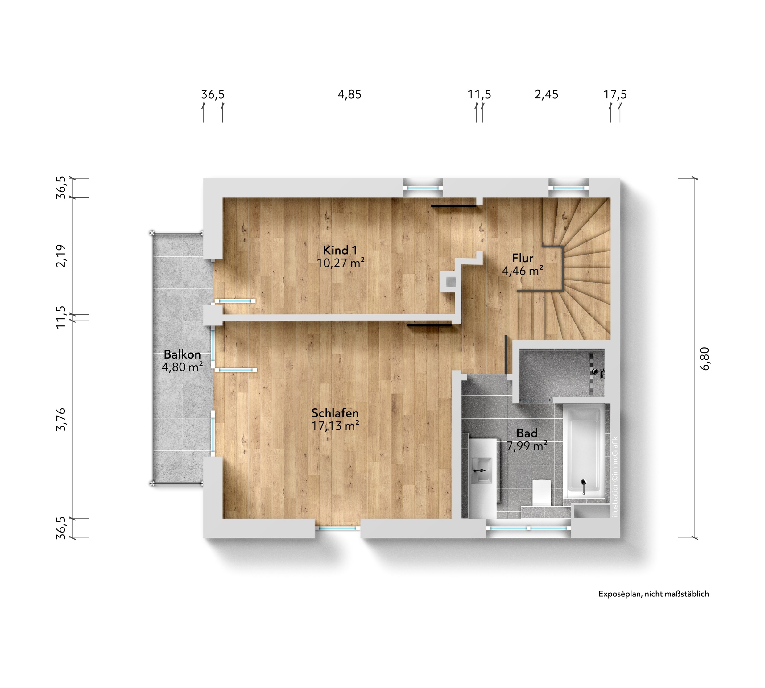 Das Dachgeschoss beherbergt ein weiteres Zimmer mit ca. 20 m² und ein separates Badezimmer mit Dusche – ideal als Homeoffice, Gästebereich oder privates Refugium.