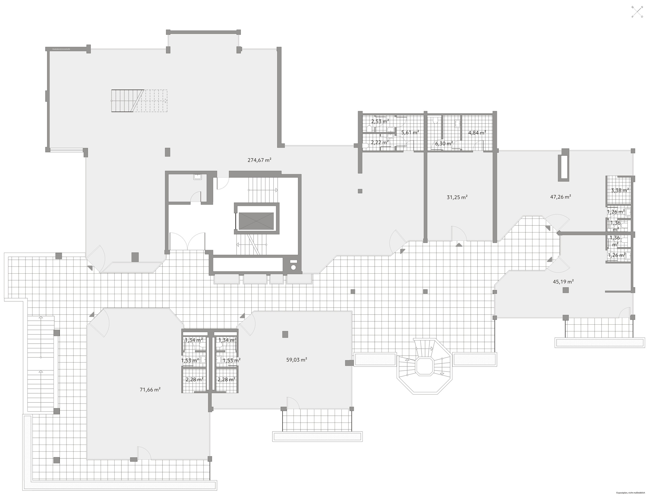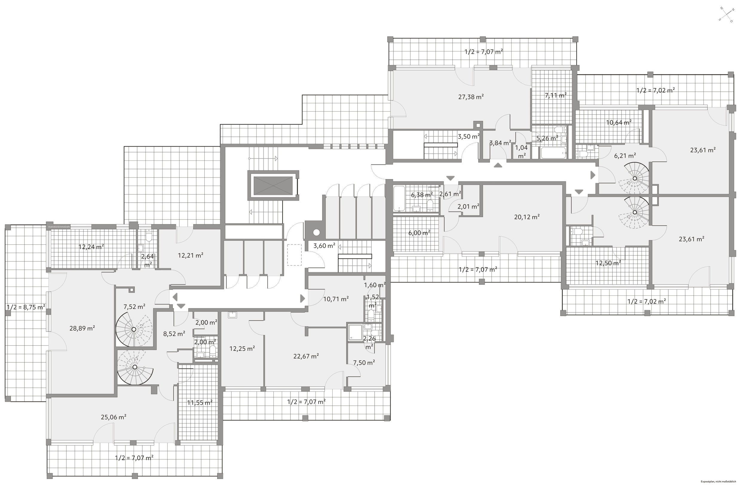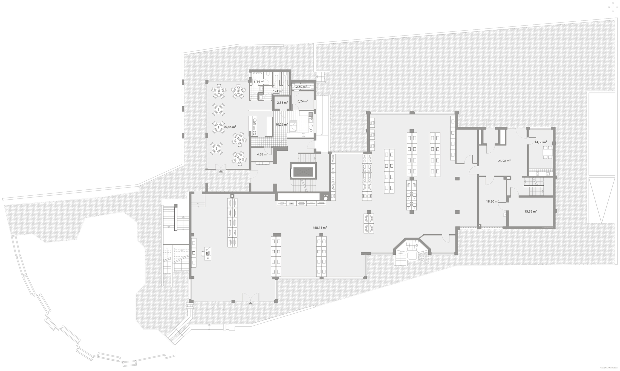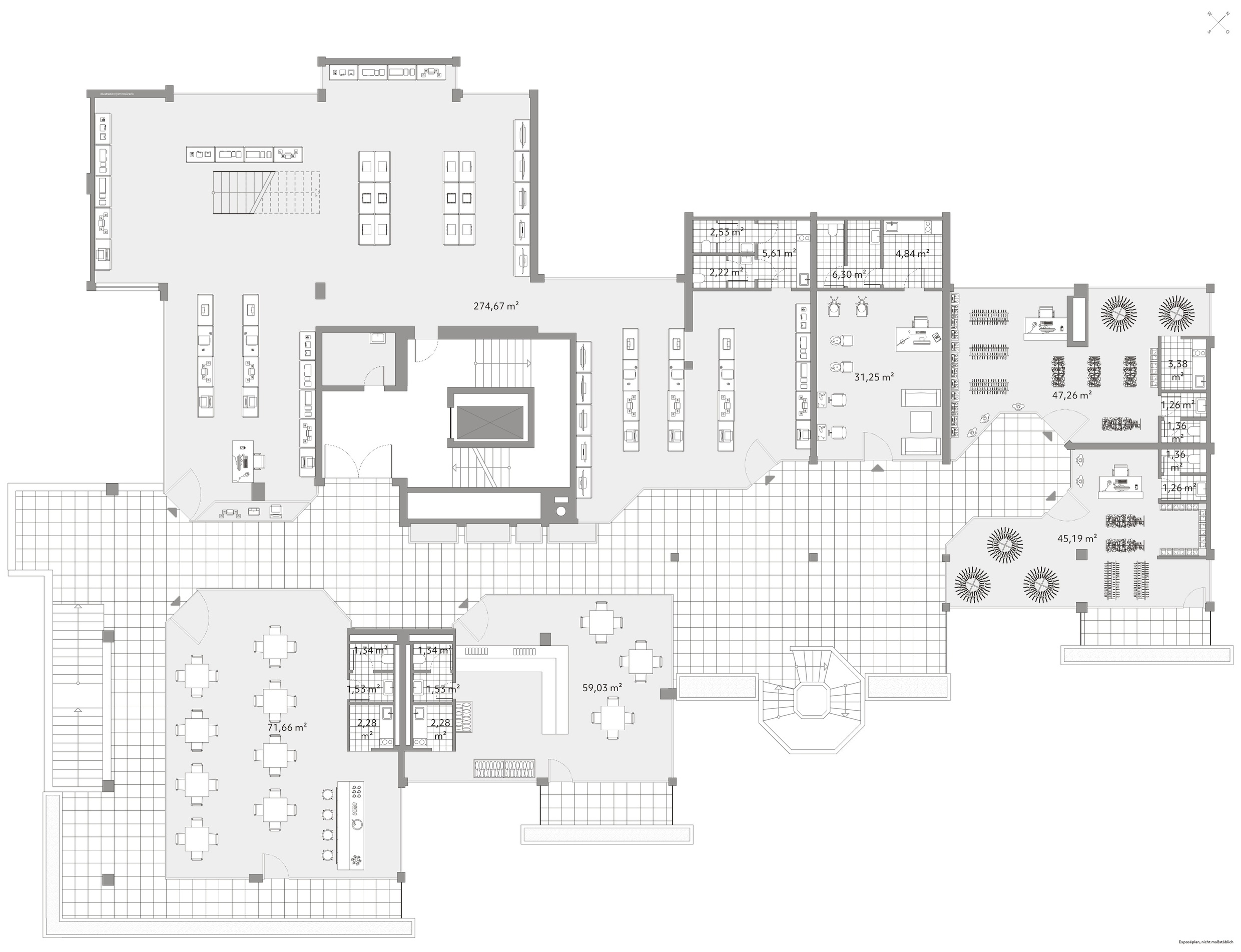 Es ist über ein innenliegendes Treppenhaus und einen eigenen Aufzug mit dem im EG befindlichen Supermarkt direkt verbunden. Hier befinden sich zwei separate Toiletten und zwei separate Umkleideräume für die Angestellten.