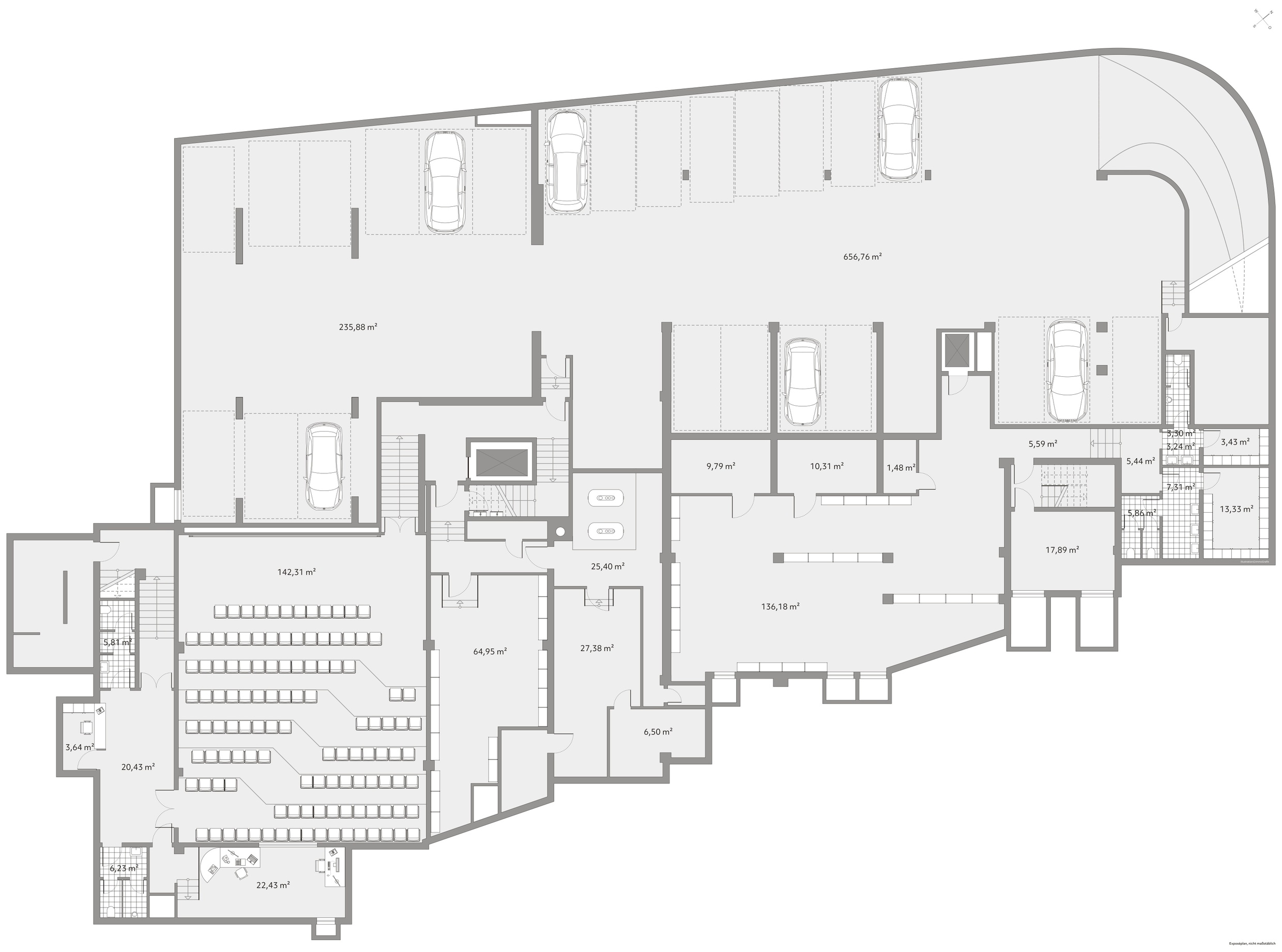 Neben dem großzügigen Lager auf ca. 152 m², gibt es einen Tiefkühlraum (ca. 9,96 m²), Kühlraum (ca. 10,34 m²), Waschraum/Kammer (ca. 3,68 m²), als auch einen Raum für die Kühlmaschinen (ca. 17,89 m²). Auch ein ehemaliger Kinosaal (entkernt, ca. 162,31 m²) ist vorhanden, welcher zuletzt als Lagerfläche genutzt wurde.