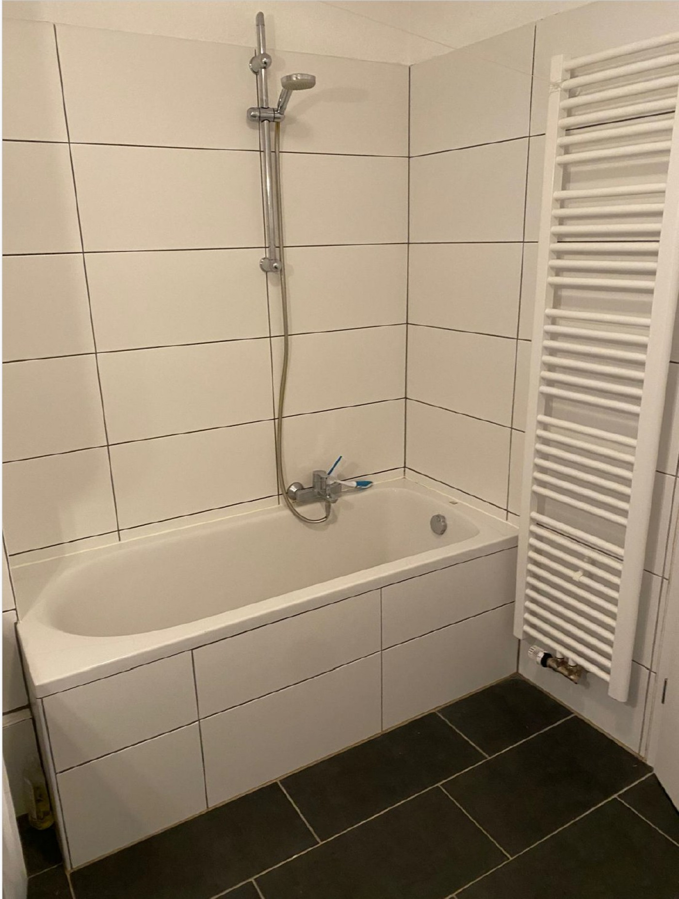 – Badezimmer mit Wanne, Waschmaschinenanschluss und Handtuchheizkörper