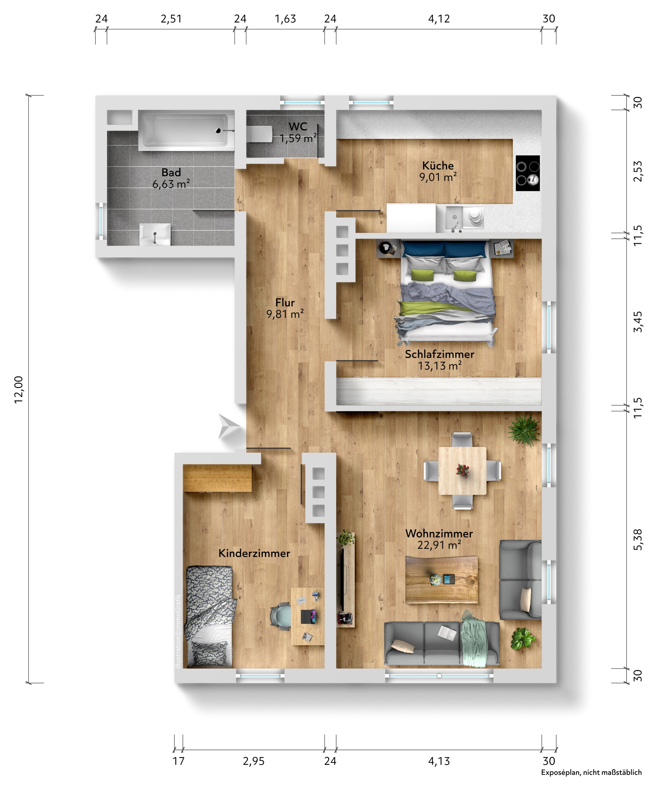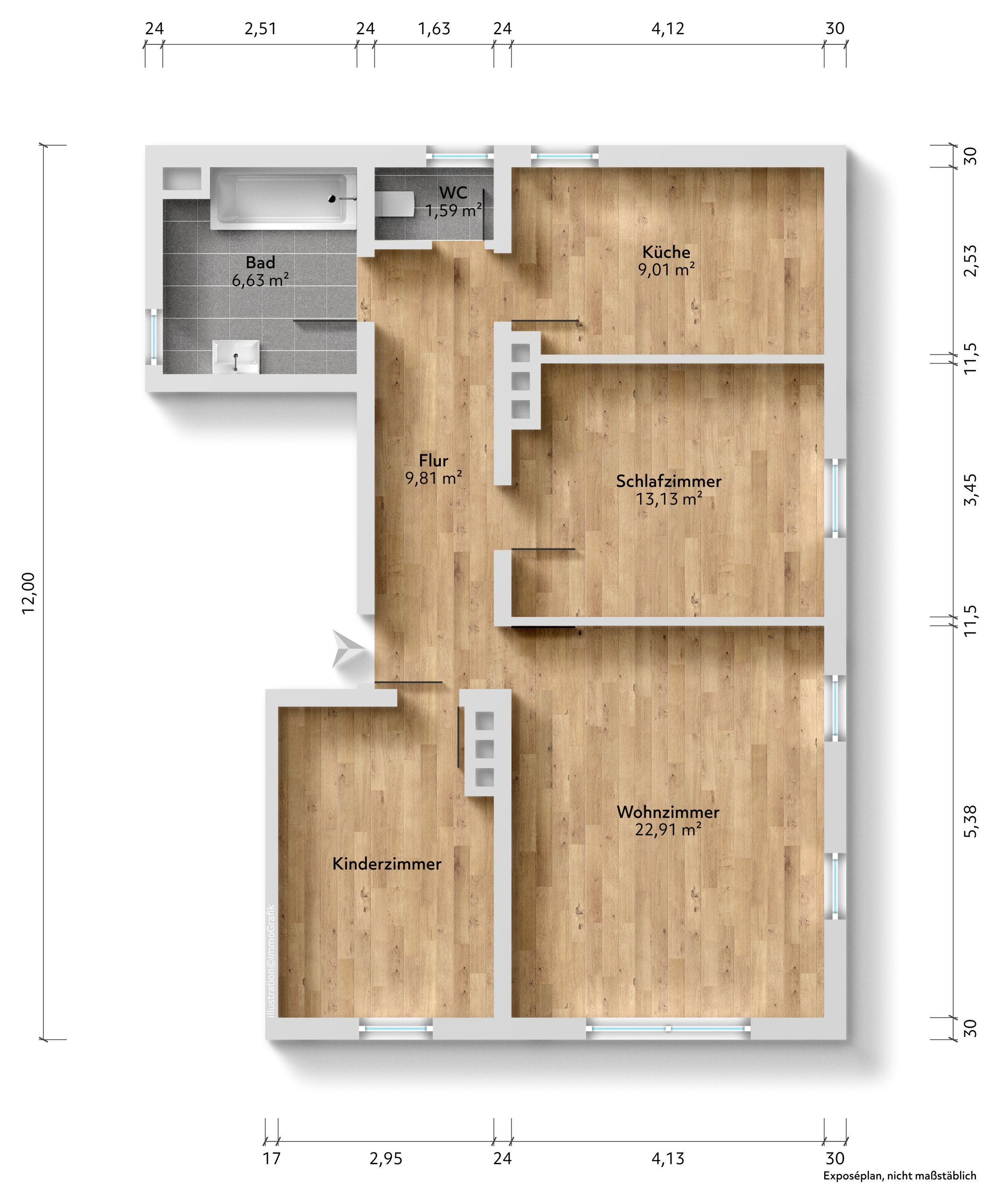 Des Weiteren verfügt sie über insgesamt drei Zimmer: Wohn-, Schlaf- und Kinderzimmer/Büro. Die Räumlichkeiten bieten ausreichend Platz für individuelle Gestaltungsmöglichkeiten. Die zahlreichen Fenster sorgen in Kombination mit der großzügigen Raumaufteilung für eine angenehme Wohnatmosphäre.