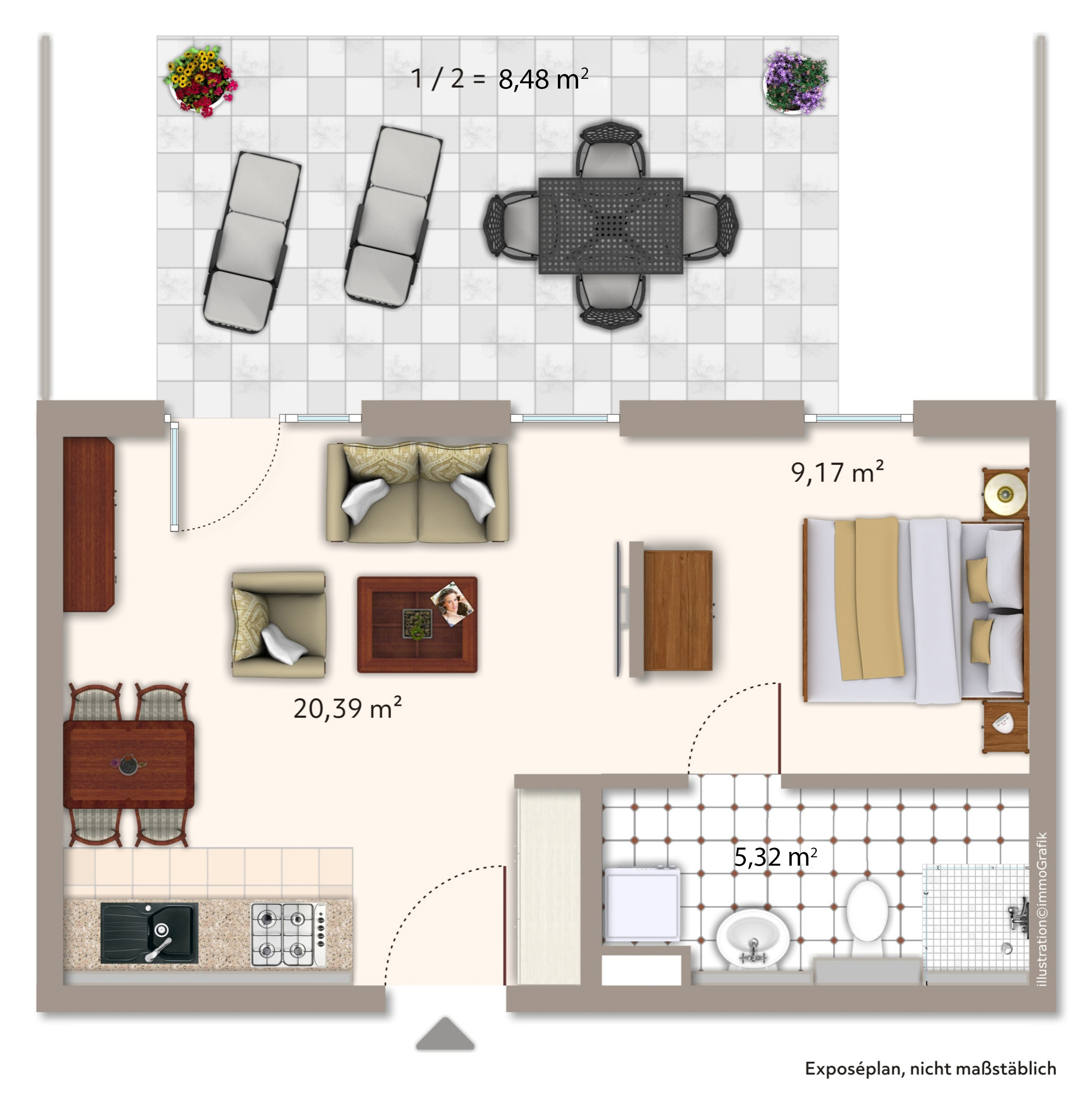 Die beigefügten Visualisierungen sind lediglich beispielhaft und erheben keinen Anspruch auf richtige oder maßstabsgetreue Darstellung des angebotenen Objekts.
