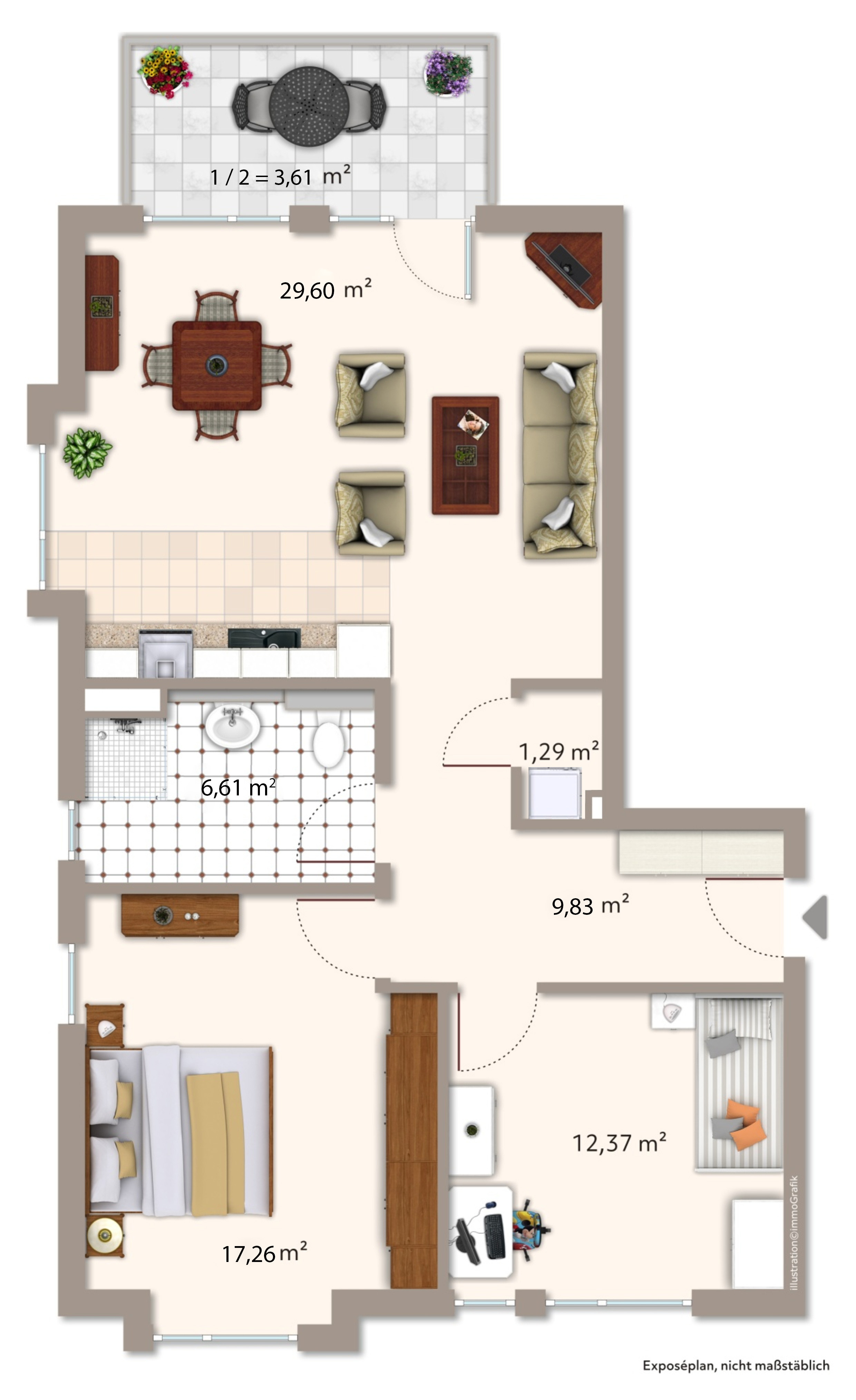 Die beigefügten Visualisierungen sind lediglich beispielhaft und erheben keinen Anspruch auf richtige oder maßstabsgetreue Darstellung des angebotenen Objekts.
