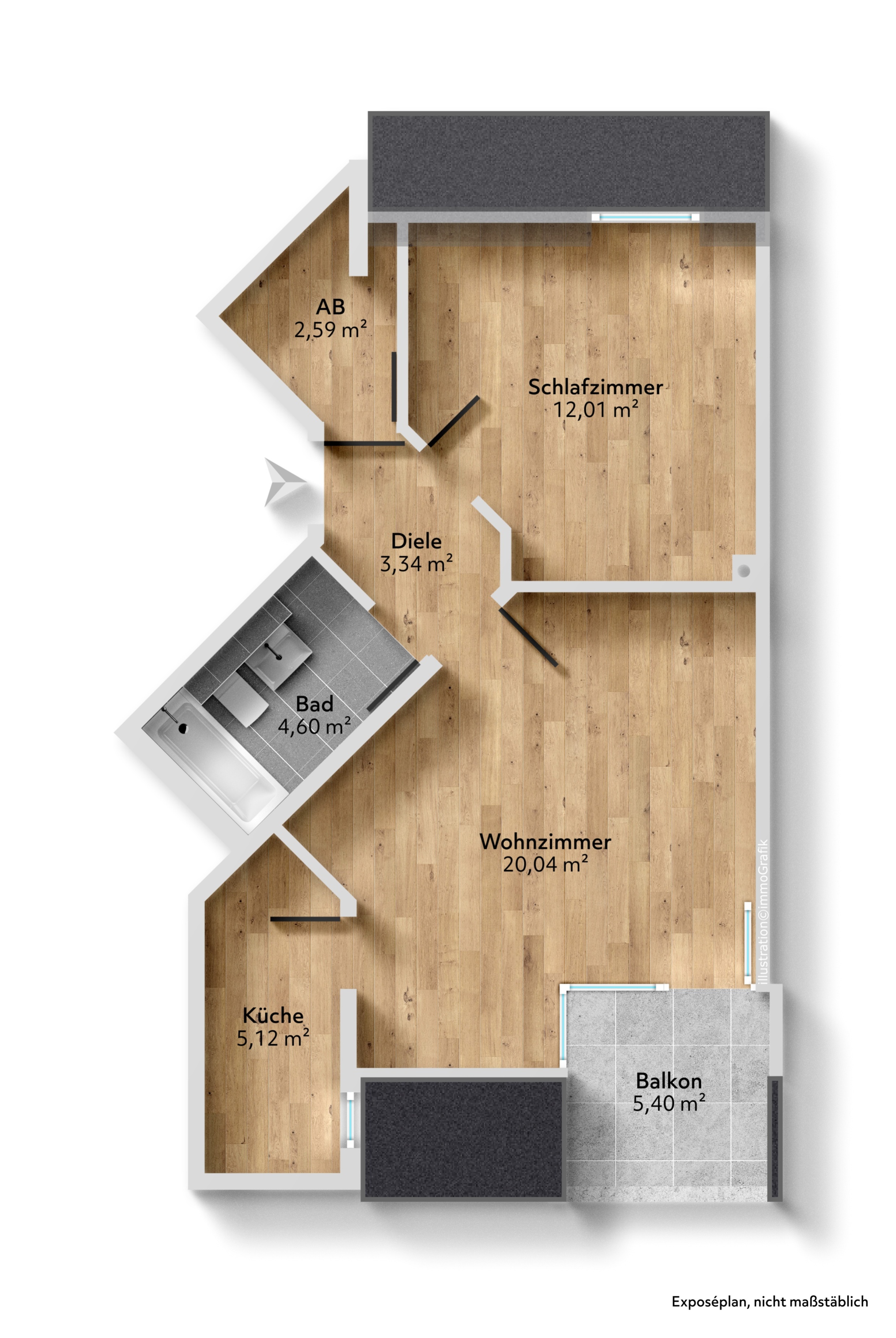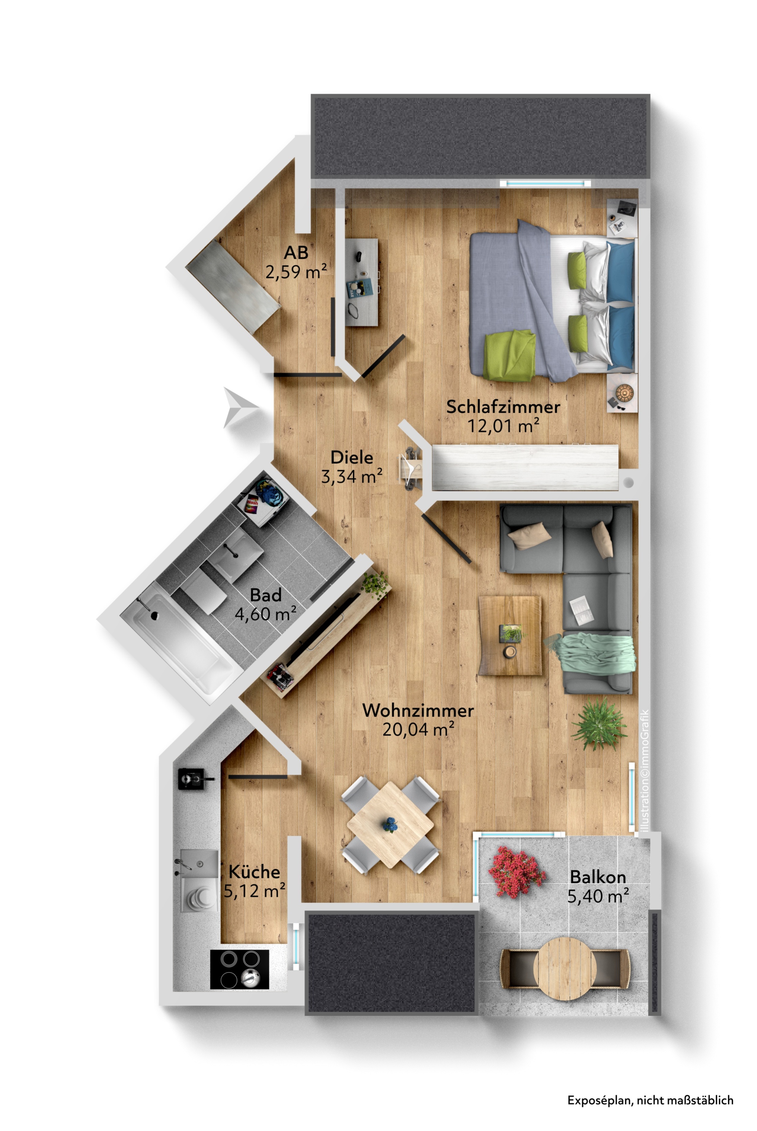 Die Wohnung verfügt über zwei Zimmer, Küche, Bad, Balkon und Abstellkammer, wobei der Grundriss die zur Verfügung stehenden Quadratmeter optimal nutzt. Dank der intelligenten Raumaufteilung bieten die Räumlichkeiten ausreichend Platz für individuelle Gestaltungsmöglichkeiten.